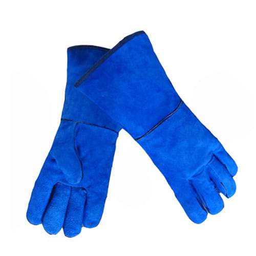 彩蓝色牛二层皮全皮电焊手套,斜拇指护缝设计,适用于焊接、切割及搬运等用途。