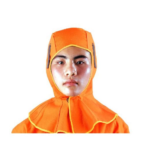 橙红色阻燃布全护式焊帽,有效保护头部和颈部。