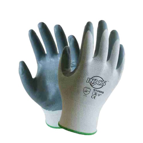 13针白色复合丝针织手套,手掌浸灰色丁腈光面
