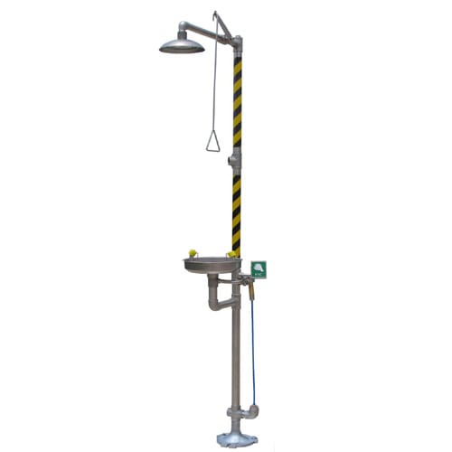 该洗眼器采用先进的温控技术来保证洗眼器管道里面的水源不会结冰,达到防冻的目的,当工厂现场水源温度为5℃时,防冻型装置开始小流量打开;水源温度高于7℃时自动关闭防冻型装置。该洗眼器在SS304材料制造,可以抗酸、碱、盐和油类化学品物质的腐蚀,配置喷淋部分与洗眼部分,直接安装在工厂现场的地面上,连接饮用自来水;当化学品物质喷溅到工作人员眼部、面部或者身体其他部位的时候,打开复合式洗眼器的喷淋开关,对身体或者服装进行大水量冲洗,或者打开洗眼部分对受伤的眼部、面部进行大水量的冲洗,冲洗时间>15分钟;喷淋水流量:>75.7L/MIN,洗眼/洗脸水流量:>11.4L/MIN,洗眼水流量:>1.5L/MIN。