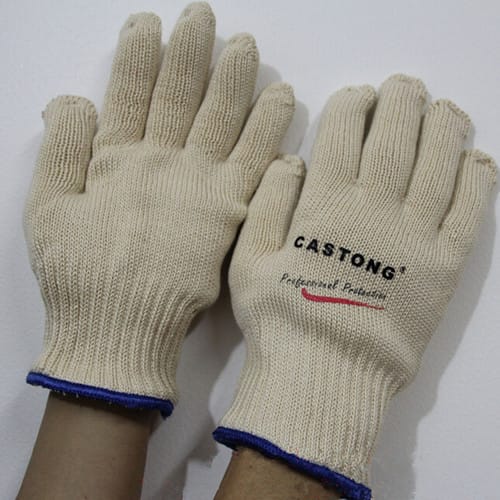 主要面料为间位芳纶(Meta Aramid)弹性针织布,它耐磨,防割,耐温300℃,阻燃,符合美国FDA食品卫生标准,表面无浮毛 ;