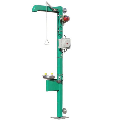 该洗眼器配置喷淋部分与洗眼部分,直接安装在工厂现场的地面上,连接饮用自来水;当化学品物质喷溅到工作人员眼部、面部或者身体其他部位的时候,打开复合式洗眼器的喷淋开关,对身体或者服装进行大水量冲洗,或者打开洗眼部分对受伤的眼部、面部进行大水量的冲洗,冲洗时间>15分钟;喷淋水流量:>75.7L/MIN,洗眼/洗脸水流量:>11.4L/MIN,洗眼水流量:>1.5L/MIN。
