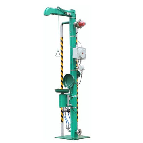 该洗眼器配置喷淋部分与洗眼部分,直接安装在工厂现场的地面上,连接饮用自来水;当化学品物质喷溅到工作人员眼部、面部或者身体其他部位的时候,打开复合式洗眼器的喷淋开关,对身体或者服装进行大水量冲洗,或者打开洗眼部分对受伤的眼部、面部进行大水量的冲洗,冲洗时间>15分钟;喷淋水流量:>75.7L/MIN,洗眼/洗脸水流量:>11.4L/MIN,洗眼水流量:>1.5L/MIN。