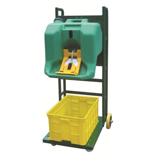 该便携式洗眼器配置小推车,在小推车上面配置16加仑或者8加仑储水箱,适用于没有固定水源或者需要经常变换工作岗位的地方使用,最大的优点:不需要安装,移动速度快,广泛适用于化工、石油、电子、冶金、港口等地区使用。