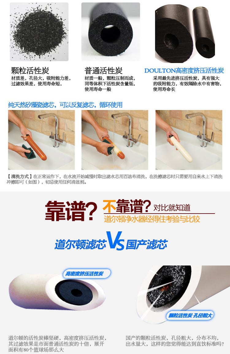 道尔顿采用最先进挤压装活性碳,能有效隔除水中有害的化学品,例如氯气,杀虫剂及农药,有机性物质,石棉纤维,滤除异味,异色及三卤甲烷等致癌物。