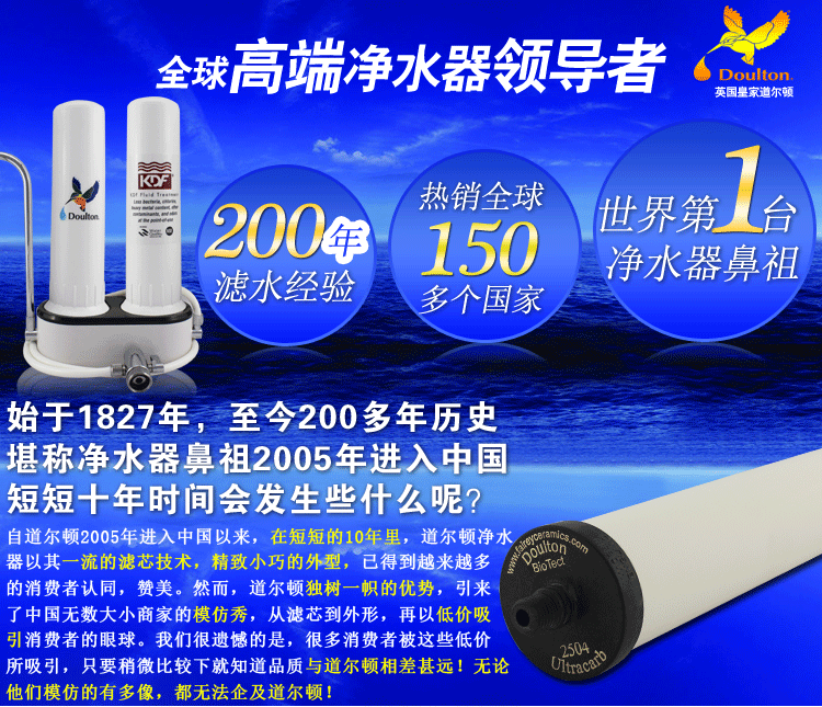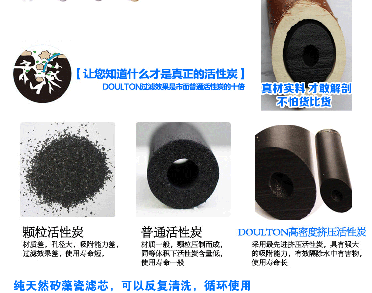 道尔顿采用最先进挤压装活性碳,能有效隔除水中有害的化学品,例如氯气,杀虫剂及农药,有机性物质,石棉纤维,滤除异味,异色及三卤甲烷等致癌物。