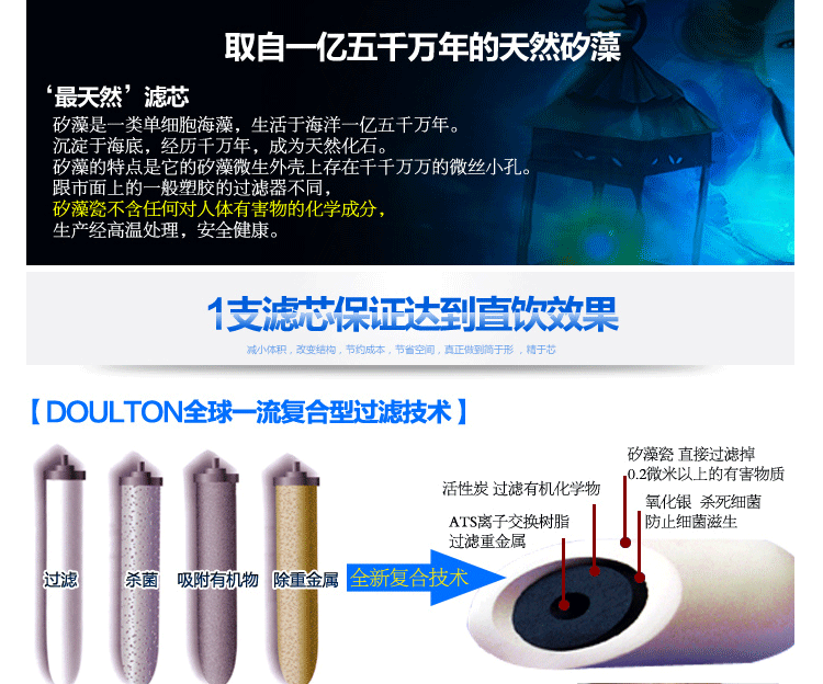 矽藻瓷滤芯外胆加有用来防止细菌滋长的银元素,陶瓷坚固的结构绝对防止银元素脱落溶入水中。过滤後水质清纯丶可即时饮用,无需煮沸。