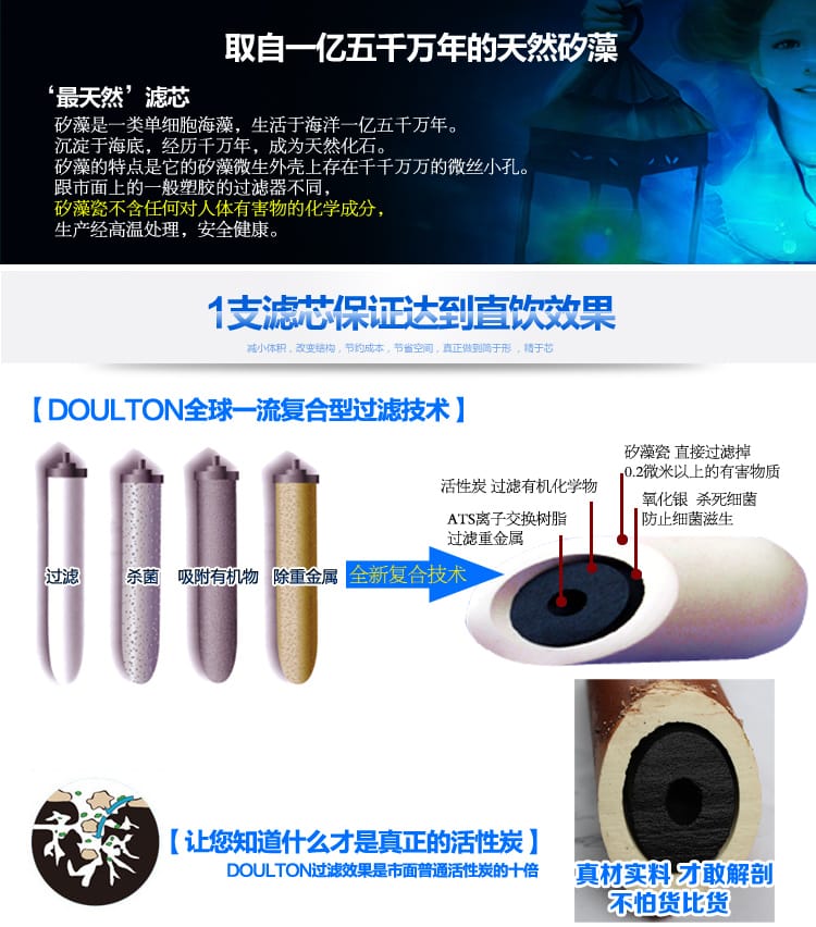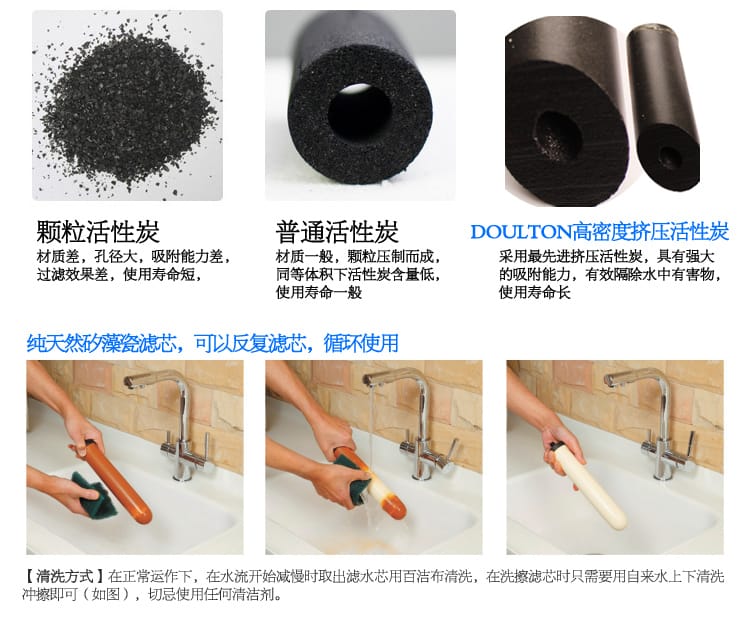 5、安全、环保、经济(无需用电,不产生废水,纯天然矽藻瓷滤芯可以多次清洗重复再用);