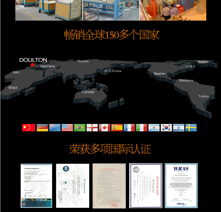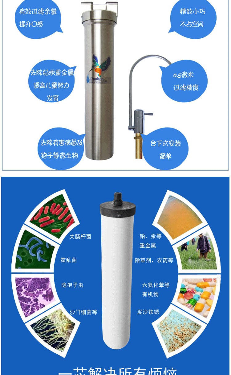 道尔顿采用最先进挤压装活性碳,能有效隔除水中有害的化学品,例如氯气,杀虫剂及农药,有机性物质,石棉纤维,滤除异味,异色及三卤甲烷等致癌物。