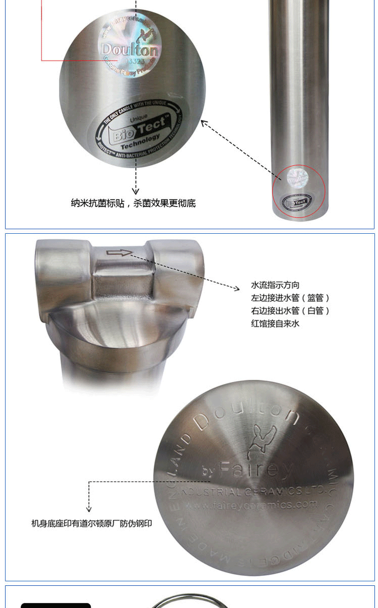 矽藻瓷滤芯外胆加有用来防止细菌滋长的银元素,陶瓷坚固的结构绝对防止银元素脱落溶入水中。过滤後水质清纯丶可即时饮用,无需煮沸。