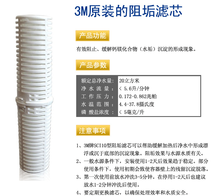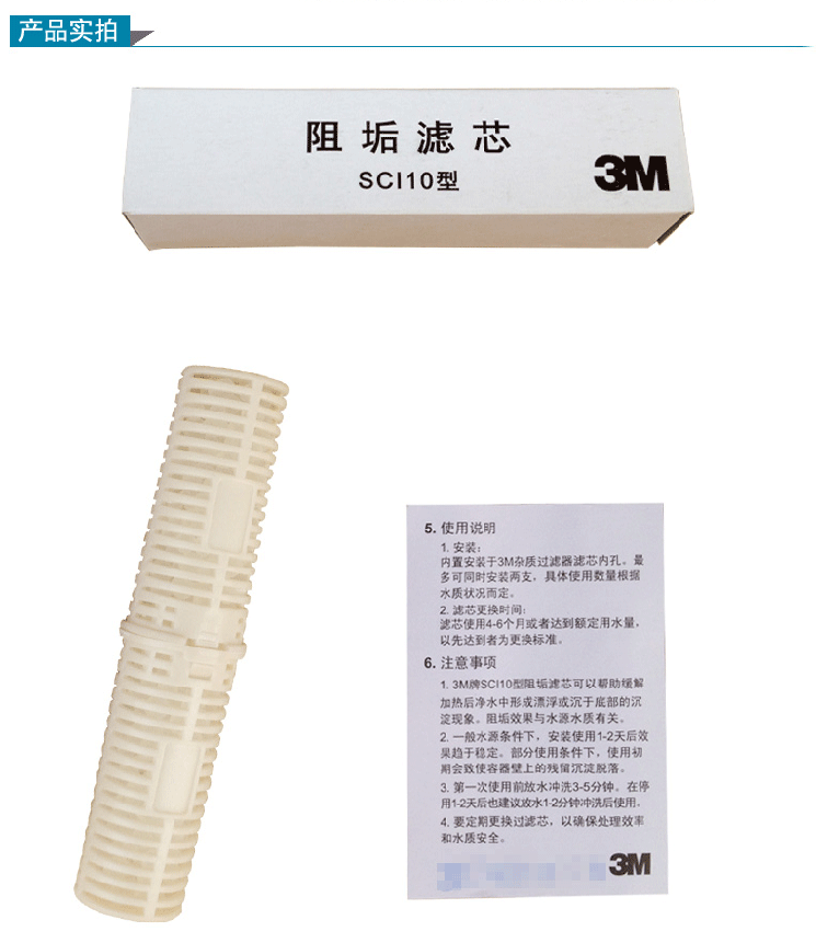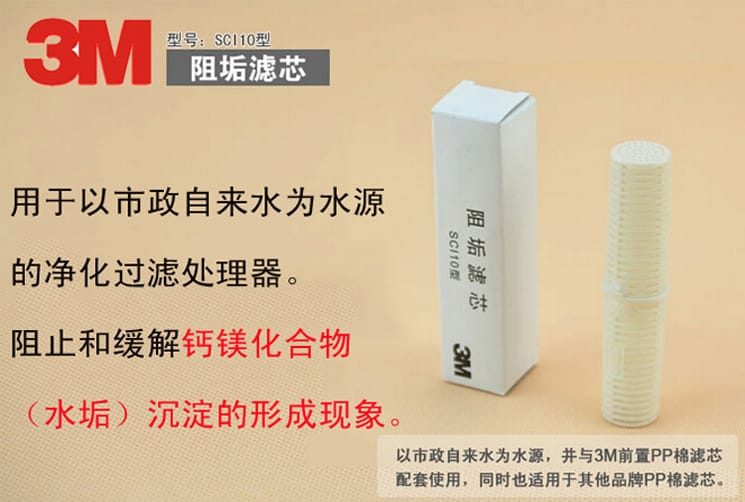 1、3M牌SCI10型阻垢滤芯可以帮助缓解加热后净水中形成漂浮或沉于底部的沉淀现象。阻垢效果与水源水质有关。