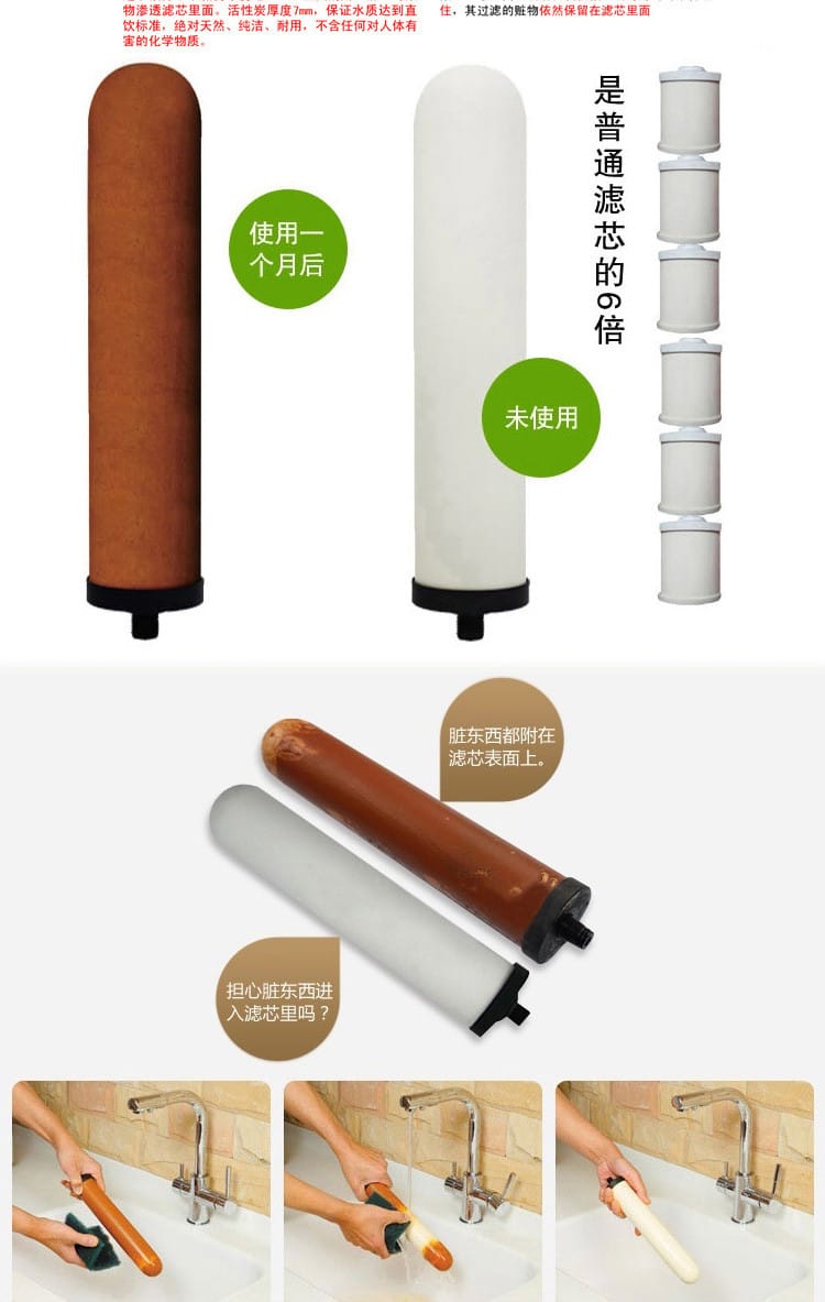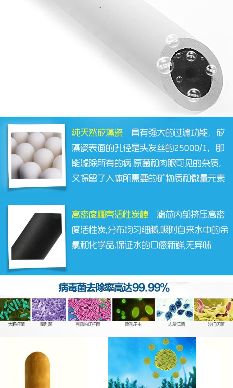矽藻瓷滤芯外胆加有用来防止细菌滋长的银元素,陶瓷坚固的结构绝对防止银元素脱落溶入水中。过滤後水质清纯丶可即时饮用,无需煮沸。