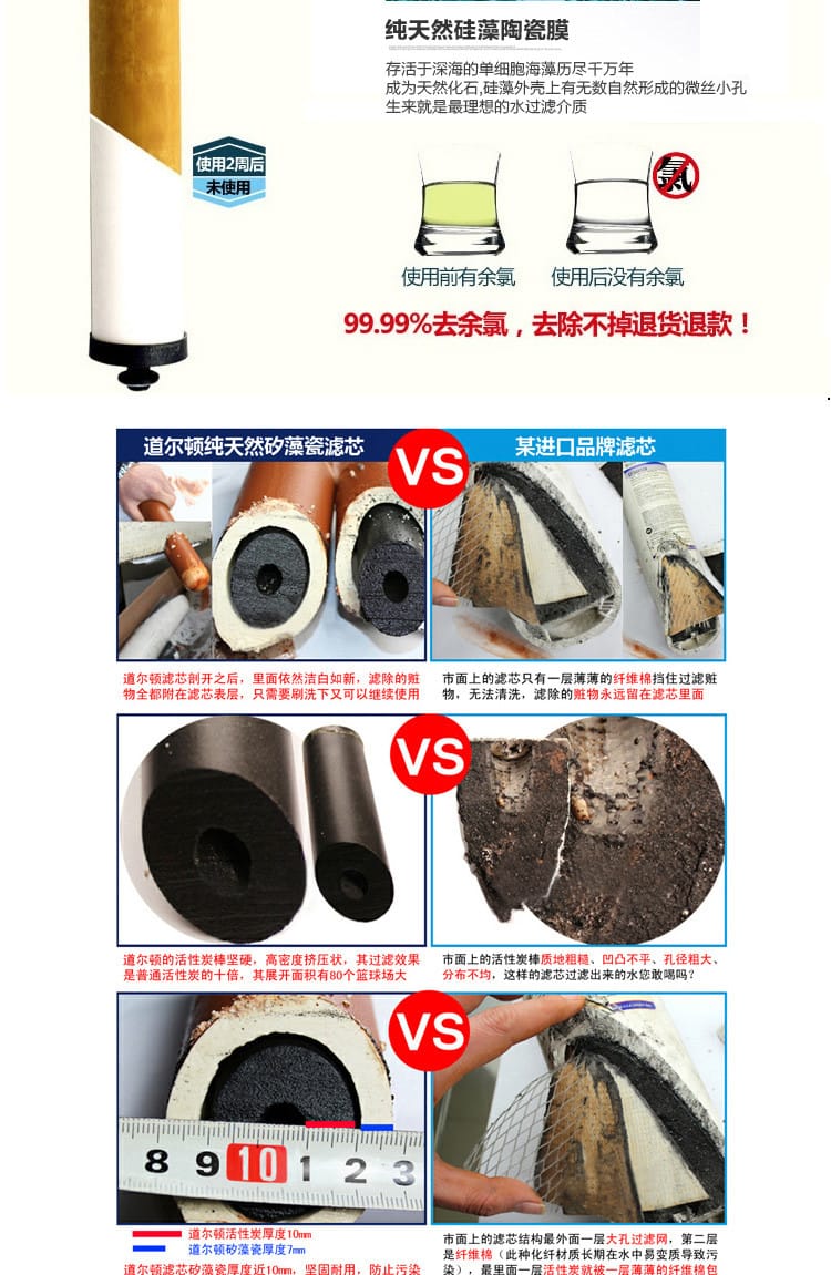 道尔顿采用最先进挤压装活性碳,能有效隔除水中有害的化学品,例如氯气,杀虫剂及农药,有机性物质,石棉纤维,滤除异味,异色及三卤甲烷等致癌物。
