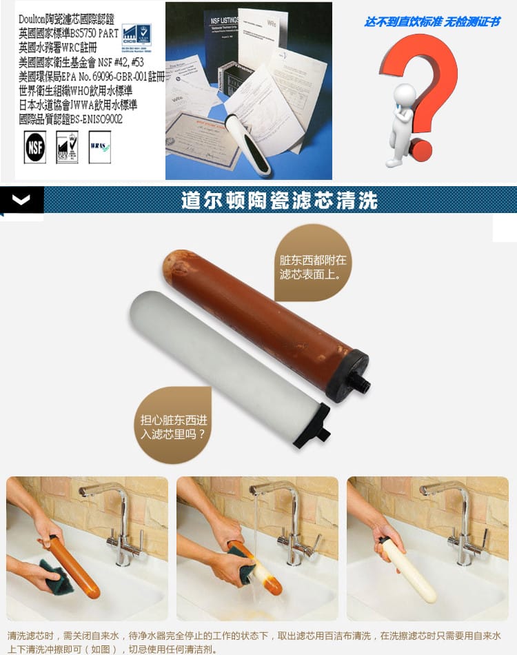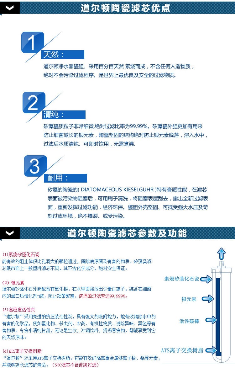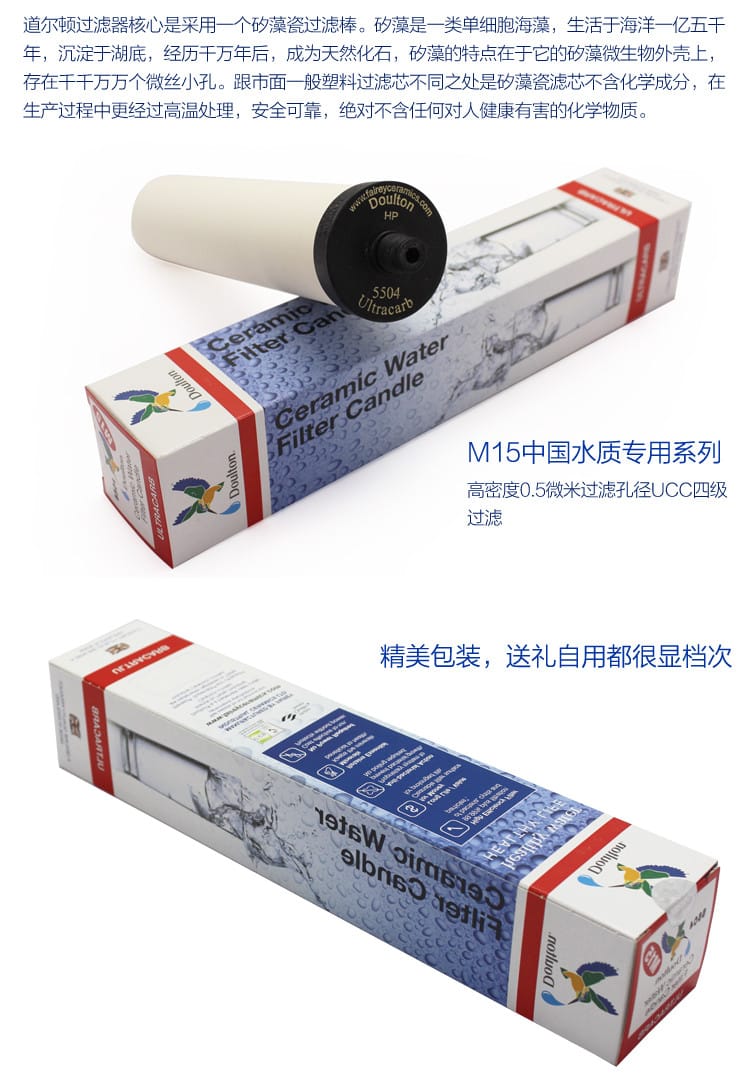 矽藻瓷滤芯外胆加有用来防止细菌滋长的银元素,陶瓷坚固的结构绝对防止银元素脱落溶入水中。过滤後水质清纯丶可即时饮用,无需煮沸。