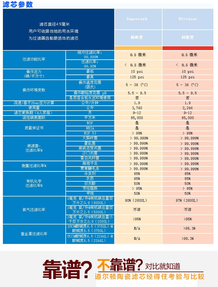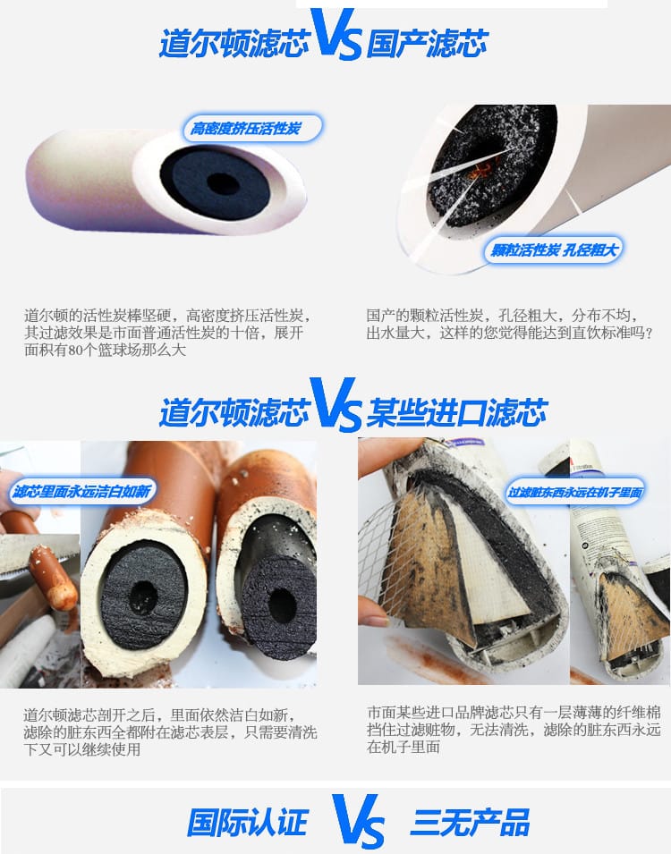 道尔顿采用最先进挤压装活性碳,能有效隔除水中有害的化学品,例如氯气,杀虫剂及农药,有机性物质,石棉纤维,滤除异味,异色及三卤甲烷等致癌物。