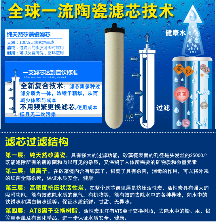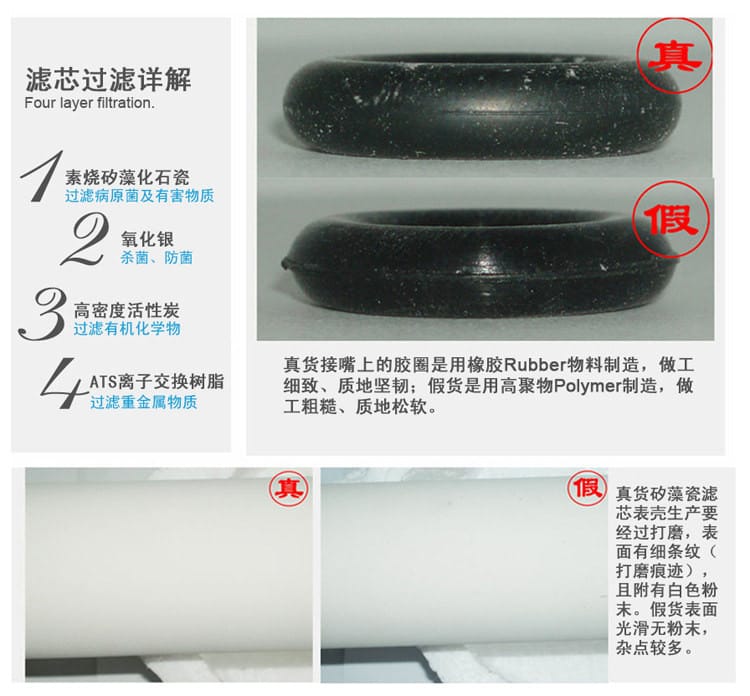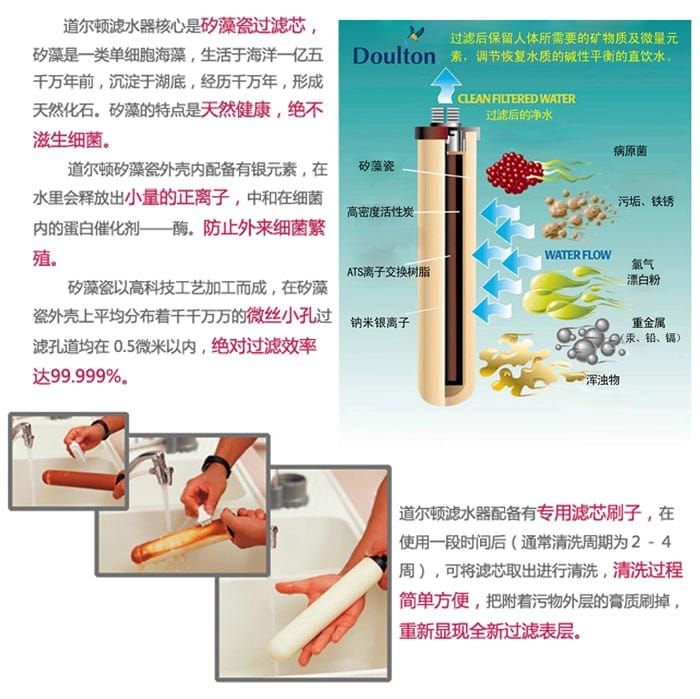 矽藻瓷滤芯外胆加有用来防止细菌滋长的银元素,陶瓷坚固的结构绝对防止银元素脱落溶入水中。过滤後水质清纯丶可即时饮用,无需煮沸。