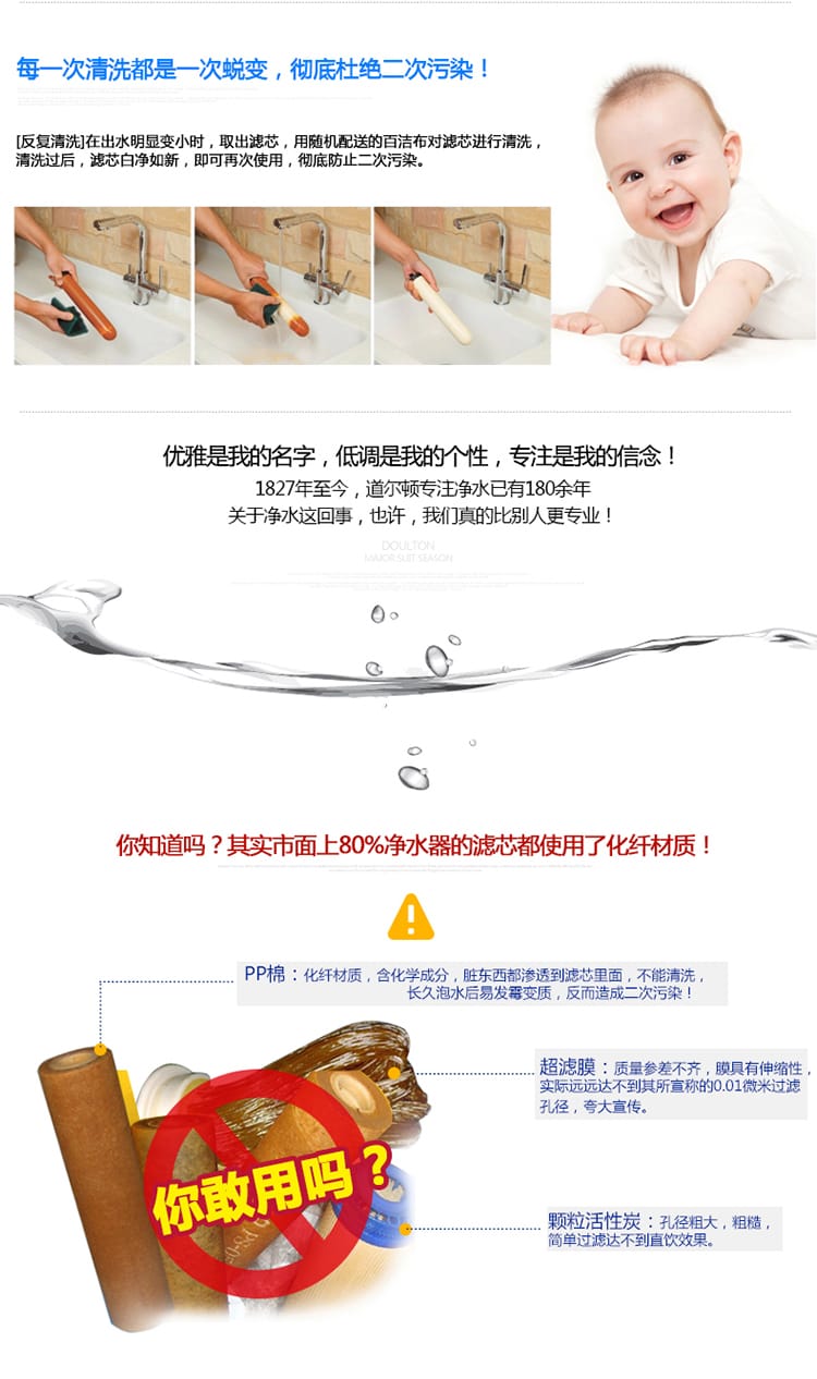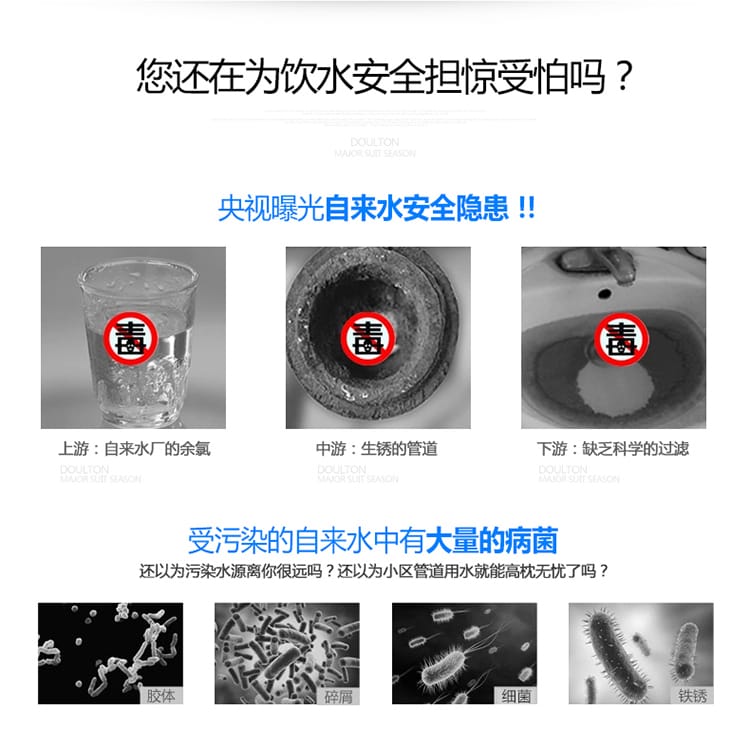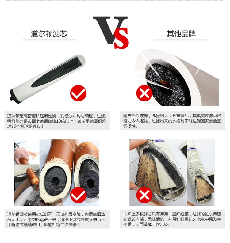 道尔顿采用最先进挤压装活性碳,能有效隔除水中有害的化学品,例如氯气,杀虫剂及农药,有机性物质,石棉纤维,滤除异味,异色及三卤甲烷等致癌物。