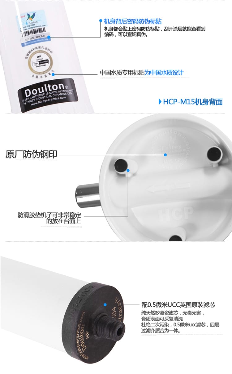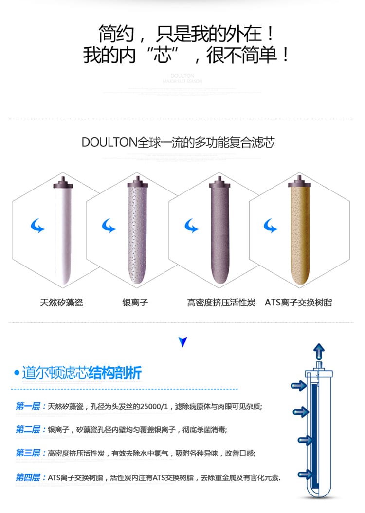 矽藻瓷滤芯外胆加有用来防止细菌滋长的银元素,陶瓷坚固的结构绝对防止银元素脱落溶入水中。过滤後水质清纯丶可即时饮用,无需煮沸。