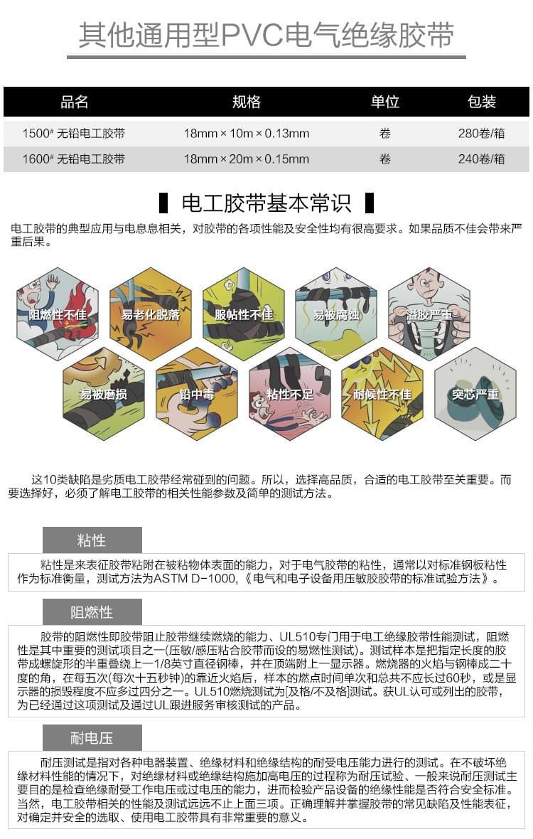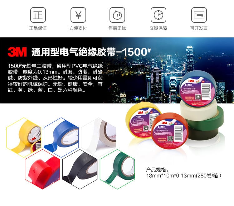 3M电工胶带PVC电气绝缘胶带无铅防潮耐高温阻燃胶布多色 通用1500