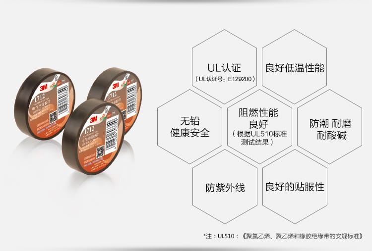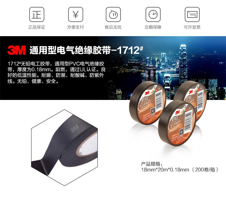 3M电工胶通用型电气绝缘胶带耐磨阻燃电老虎无铅PVC电工胶布1712